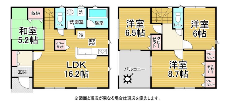 | 備考 | ※敷地内に電柱及び支線が入る場合があります。 ※図面と現況が相違する場合は、現況を優先とします。 ※建物面積に別途ルーフバルコニー約8.5平米有 |